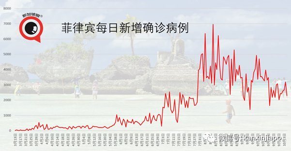 10月5日,菲律宾新增2291起确诊病例(累计324762起),从图表上看,菲律宾疫情正处于高峰之后的缓降。 菲律宾当天通报64起新增死亡病例(累计5840起)。 10月5日,菲律宾独立民调机构“亚洲脉动”(Pulse Asia)发表民调结果,9月受访的1200名菲律宾成年人当中,91%对总统杜特尔特的执政表现感到满意,比去年12月的87%还要高,显示民众将菲律宾经济衰退归咎于冠病疫情,而非政府失职。 泰国昨增5起境外输入其中一人为包机机组成员