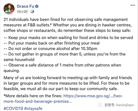 无视安全管理措施21名食客遭罚300新币昨日(10月6日),新加坡永续发展与环境部长傅海燕在脸书上发帖表示,21名食客在进餐时违反安全管理措施,各被罚300新币。