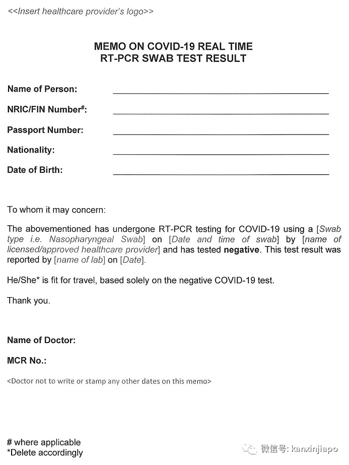 根据新加坡政府通报,自10月5日起,赴华直航航班乘客所持统一格式核酸检测阴性证明由此前三种调整为一种(见附件)。赴华直航航班乘客可持调整后统一格式核酸检测阴性证明和《持核酸检测阴性证明直接登机旅客申报表》(该表须与有效核酸检测证明一起使用方可登机,可自行在使馆网站下载打印填写,无需使馆审核)直接登机。持非统一格式核酸检测阴性证明的赴华旅客和在新加坡转机赴华人员或自新加坡去往其他国家(地区)转机赴华人员,仍需提前申领带“HS”标识的绿色健康码或健康状况声明书。旅客在获取核酸检测阴性证明后,务必确认证明上所载的姓名、护照号码(需为现持有效旅行证件,如中国护照、旅行证等)无误。不得涂改、伪造相关证明,否则将承担相应法律责任。如不确信是否符合直接登机条件,也可按原有方法向使馆申请核酸健康码或健康状况声明书。 中国驻新加坡使馆领事保护与协助紧急求助电话:+65-64750165(24小时),+65-81296456(疫情期间临时领保专线,工作日上午08:30-12:30,下午14:30-18:30)外交部全球领事保护与服务应急呼叫中心电话:+86-10-12308或+86-10-59913991 中国驻新加坡大使馆 2020年10月8日附件:调整后统一格式核酸检测阴性证明样本