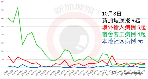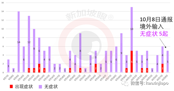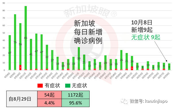 从8月29日至10月8日,新加坡一共出现1226起病例,出现症状的有54起,占4.4%,其余95.6%为无症状,有1172起。 连续24日无新增感染群 10月8日,卫生部通报无新增感染群。 自9月15日起,连续24天无新增感染群。希望能维持零新增。 境外输入昨增5起含2起海员,与先前4起有关联