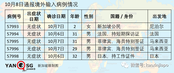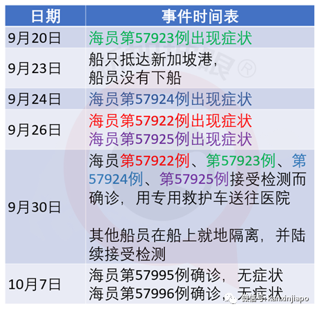 昨天通报确诊的有2人是菲律宾籍海员,一人31岁(第57995例),一人29岁(第57996例)。船只从马来西亚出发,9月23日抵达新加坡港之后,船员没有下船。 根据新加坡卫生部信息,船只抵达新加坡港之前,已有船员出现症状。抵达新教派港之后,4个出现症状的船员于9月30日确诊,送往医院,其他船员就地隔离并陆续接受检测。 第57995例和第57996例检测结果呈阳性,无症状,于10月7日确诊。