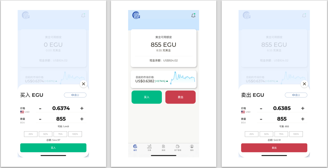 2. 主页面操作一目了然 注册成功后即可进入操作主页面。Everest Gold APP的主页面设计清爽直观:交易、新闻、资产和个人信息一目了然。对于零等级的黄金交易新手来说,这样的页面设计实用性高,便于操作。 开始交易前,新用户需要通过个人身份认证(KYC),绑定手机号码(若使用邮箱注册),同时需要通过上传本人银行流水验证绑定银行账号。Everest Gold与第三方支付公司Xfer合作,银行账号验证速度极快。一切准备就绪后,用户就可以开启黄金交易之旅了! 3. 网上交易尽在一键之间 Everest Gold APP主页面上实时更新EGU黄金价格,主页面上显示市场上0.01克黄金或1个Everest Gold Unit黄金单位(1EGU)的价格图表,相应下方有“购买”和“出售”的大号按健,点击进入后选择要交易的EGU数量,或者选择出售总资金的百分比。