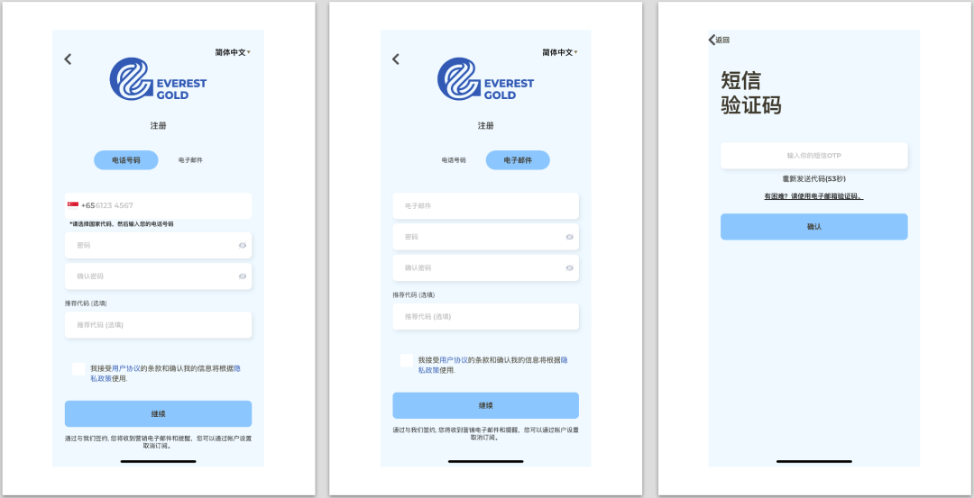1. 轻松注册账户 探索Everest Gold应用程序,第一步从注册账户开始。相比很多证券交易APP,Everest Gold APP的注册过程比较简单,没有太多复杂选项,只需要提供用户邮箱或者电话号码,在输入手机验证码后就可以完成注册过程。当然,指纹或者面部识别认证的选项也有,操作很轻松。
