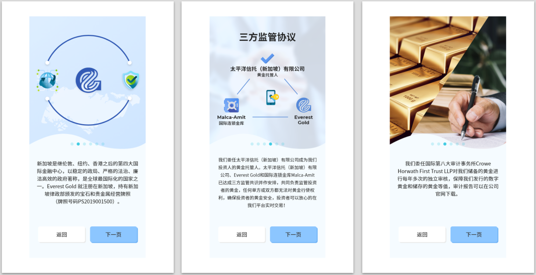 作为审计必要流程,用户输入个人资料是不可避免的程序之一。Everest Gold APP在应用界面上详细介绍了其严密的审计流程,遵循行业标准的加密措施。Everest Gold成立于新加坡,受新加坡律政部监管,受《2019年宝石和贵金属法案》(PreciousStones and Precious Metals Act 2019)约束(牌照号PS20190001500),用户可以放心填写个人资料。