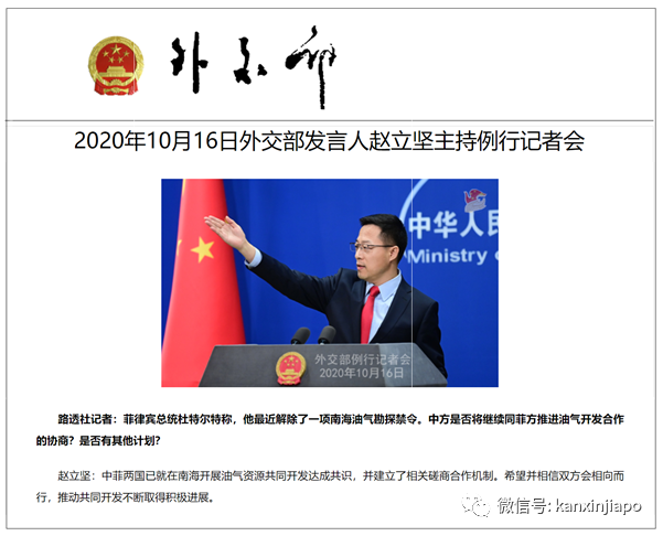 据法新社马尼拉10月16日报道:菲律宾能源部长库西说,2014年颁布的石油勘探禁令的解除,将加速协商,也有助于提振菲律宾因疫情受创的经济,并带动投资。 他也说,重启探勘与开发活动的决定是菲律宾单方面的,政府拍板前并未知会北京当局。 中国外交部回应 10月16日,中国外交部发言人赵立坚在例行记者会上应询时说,中菲两国已就在南海共同开发油气资源问题上达成共识。