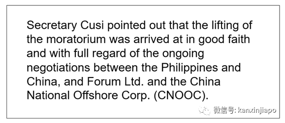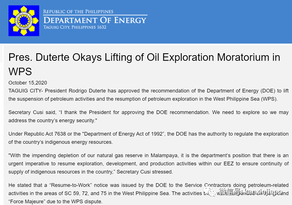 (菲律宾能源部发布文告表示,菲律宾总统杜特尔特已解除在南中国海争议海域的石油勘探禁令。图源:菲律宾能源部网站) 在文告中,菲律宾能源部长库西表示,菲律宾以西的马兰帕亚气田的天然气储量料将枯竭,现在迫切需要恢复菲律宾专属经济区内的石油勘探、开发和生产工作,以确保电力供应。