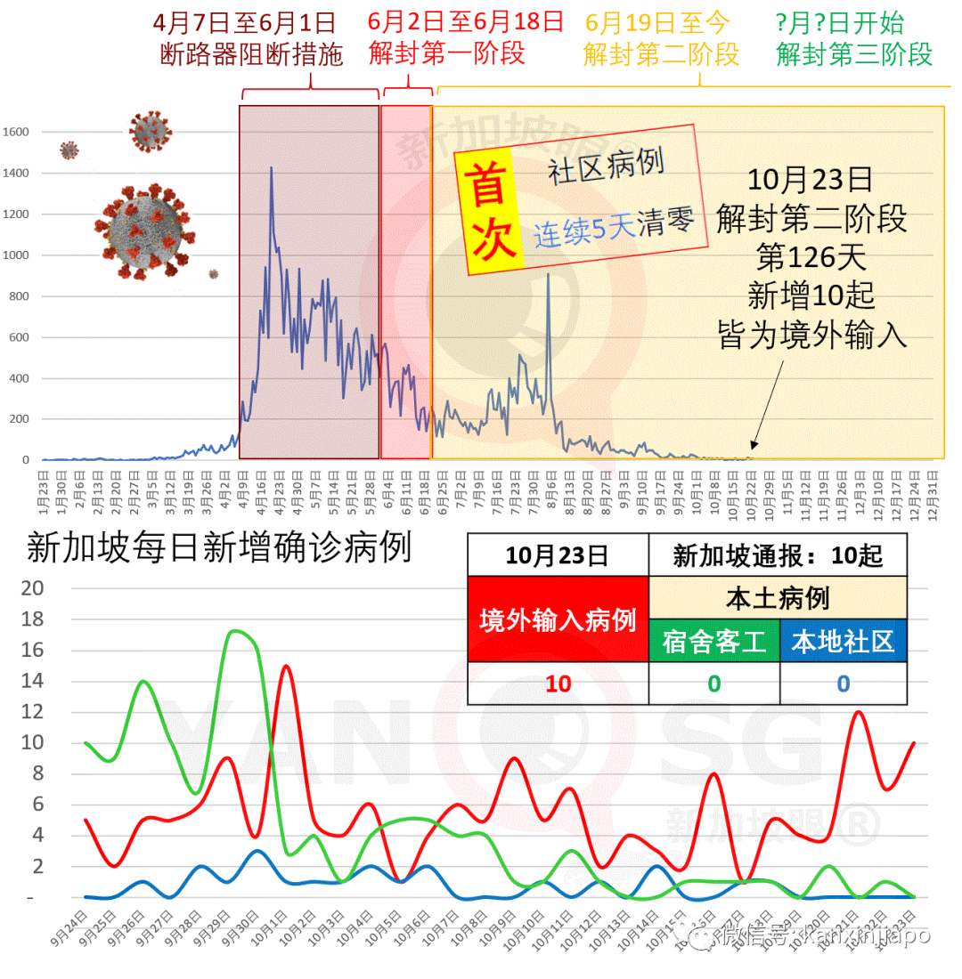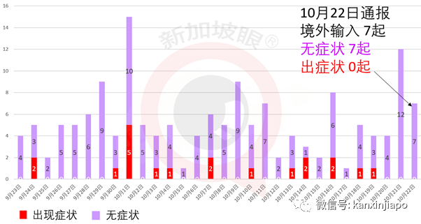 从8月29日至10月22日,新加坡一共出现1318起病例,出现症状的有66起,占5.0%,其余95.0%为无症状,有1252起。 新加坡自9月15日未出现新感染群。 本土病例昨增1起本地社区首次连续4天零新增