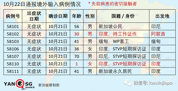 昨天通报境外输入病例7起,皆无症状,在指定地点执行14天居家通知SHN时,检测结果呈阳性而确诊。 此7起病例情况如下: 出发地:印度3人、印尼2人、阿联酋、缅甸各1人 国籍:印度籍3人、印尼籍2人、缅甸籍1人、新加坡公民1人、新加坡永久居民1人 身份:持STVP短期探访证3人、新加坡公民1人、新加坡永久居民1人、WP客工1人、持工作证件1人