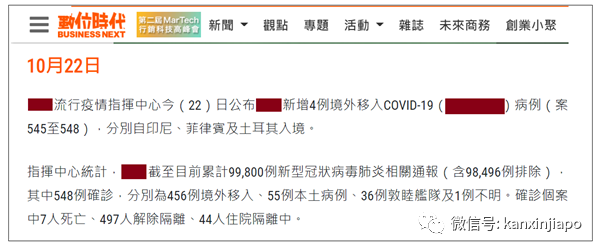 境外通报的台湾输入病例 《新加坡眼》注意到,台湾流行疫情指挥中心有好几次发布关于境外通报的台湾输入病例。 例如: 10月21日,指挥中心表示:台湾方面近日接获日本官方透过国际卫生条例对口单位(IHR National Focal Point)通知,日本检出3例自台湾入境之冠病抗原阳性个案,分别为未足岁男婴、30多岁女性及1岁男童。 10月14日,指挥中心表示:台湾陆续接获日本官方透过国际卫生条例对口单位(IHR National Focal Point)通知,日本检出3例自台湾入境之冠病抗原检测阳性无症状个案。接获通报后,台湾方面展开疫情调查,3名个案分别为1女2男,年龄介于40多岁至60多岁,其中1人长期居住台湾,但经常往返台日两地(最近一次入境台湾时间为9月3日),其余2人于7月23日及8月25日入境台湾,来台目的分别为探亲及工作;3人于10月6日、7日及10日离台,并于入境日本时检出抗原阳性后,送至当地指定机构进行隔离。 10月7日,指挥中心表示:日本与法国都传出曾经过台湾的民众验出阳性,包含进入日本的3名男性;以及法国籍男性于2月入境过台湾,验出核酸阳性,但在台期间与离台时都无症状。 9月23日,指挥中心表示:近期台湾输出案例达19人,分别为18名菲律宾籍人士与1名日本籍,皆自台湾返国后,在当地被检验出感染新冠。 指挥中心指出,18名菲律宾籍个案中,11例于今年9月11日搭乘同班机返回菲律宾,该班机共78人自台湾出境,含9月16日已公布2名个案,该班机累计13名检验阳性个案,阳性率达16.7%,异常偏高;另有4例为9月10日同班机返菲旅客。经分析6月1日至9月20日自台湾出境至邻近国家检验阳性率,菲律宾累计检出25例,阳性率达0.48%(8月0.39%、9月2.00%),明显高于其他国家(介于0.005%至0.055%),指挥中心刻正透过正式管道向菲国了解细节。 同日,指挥中心指出,另1名日本籍个案为50多岁男性,今年8月29日入境台湾,9月12日检疫期满,9月14日返国,于入境日本时采检抗原检验结果呈阳性,因此通知台湾方面;但日前民众主动通知,9月20日及9月21日日本政府以核酸检测复验结果为阴性;个案在台接触者共匡列1人,核酸及血清抗体检验均为阴性。 此类案例尚有一些,本文不一一列举。《新加坡眼》追查到的还有: 8月19日,指挥中心指出:针对最近几起境外通报案例,包括寮国、上海与越南进行说明。 指挥中心指出,该名个案为寮国籍30多岁男性,今年2月15日来台,于北部就学,8月10日在台湾自费采检,结果为阴性,8月11日出境至韩国等待转机,8月12日入境寮国并进行采检,8月13日检验结果为阳性。 指挥中心表示,个案在台期间及返国迄今无不适症状,经初步调查,个案在台期间多在学校及周边地区活动,校外活动范围则以北部地区为主,截至目前已掌握接触者共8人,包括校内接触者及宿舍接触者等,其中3人列为居家隔离对象(核酸检验结果均为阴性,血清抗体检验1人阴性、2人检验中)、5人列为自主健康管理对象;将进一步调查个案校外活动轨迹以匡列其他可能接触者。 同一篇报道指出:另有关媒体报导越南、上海各通报1例自台湾入境之确诊个案,指挥中心已透过驻外单位取得越南个案身分资料,该名个案为越南籍40多岁男性移工,在台期间于北部工作,8月7日自台湾搭机至越南,于机场采检结果为阴性,入境越南后进行集中检疫,当地检疫场所为3人一间且共餐,与个案同住之另2人分别为自美国及日本返国之越籍人士,2人皆于8月12日出现不适症状,并后续确诊,个案则于8月15日起出现喉咙痛、发烧、腹痛症状,17日再度采检,并检出阳性。针对该名越南个案,指挥中心及地方卫生单位已启动境内疫情调查与接触者匡列等防治工作。 至于上海个案,尚未取得中国大陆方面回覆,惟指挥中心目前已接获该名个案在台友人主动联系,并初步掌握个案相关资讯,将进一步与陆方确认个案详细资料后,进行境内之疫情调查、接触者匡列等防治作为。 新加坡昨增8起确诊境外输入7起,本土病例1起 10月22日,新加坡卫生部通报新增确诊病例8起,皆无症状,累计57941起。 这8起病例当中,7起为境外输入病例,1起本土病例。