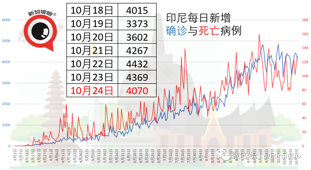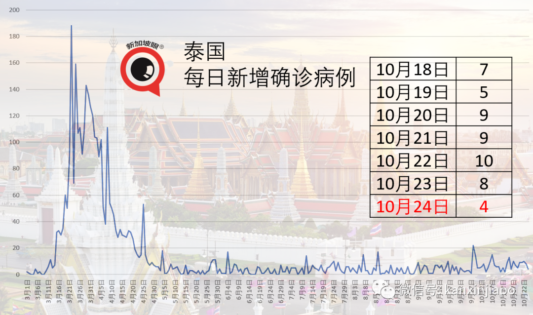 10月24日,泰国通报:确诊病例新增4起,累计3731起。这4起病例当中,3起为境外输入病例,源自奥地利1起、香港特别行政区2起,1起为本土病例。本土病例为57岁法国妇女,她与丈夫和儿子于9月30日乘搭泰国航空TG933航班从巴黎入境,执行14天集中隔离之后,于10月15日进入苏梅岛。到了10月17日,她出现发烧、咳嗽、肌肉疼痛等症状。10月20日前去私人医院作冠病检测,10月22日确诊。泰国官方将之列为本土病例,但仍在调查她究竟是否在泰国本土受到感染。两名源自香港特别行政区的分别是26岁、38岁女性。26岁港女10月21日从香港入境,当天确诊。据《曼谷邮报》报道,她在9月曾出现头疼、咳嗽、流鼻涕、肌肉疼痛、丧失味觉症状。38岁港女也是10月21日从香港入境,当天确诊。她10月2日丧失嗅觉,从10月3日至13日住在集中隔离中心。泰国自9月18日以来无新增死亡病例,维持在59起。印尼昨增4070起确诊