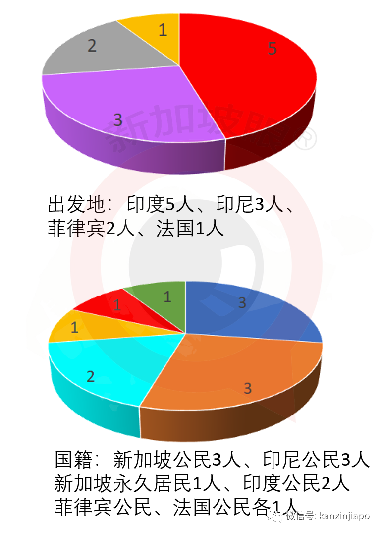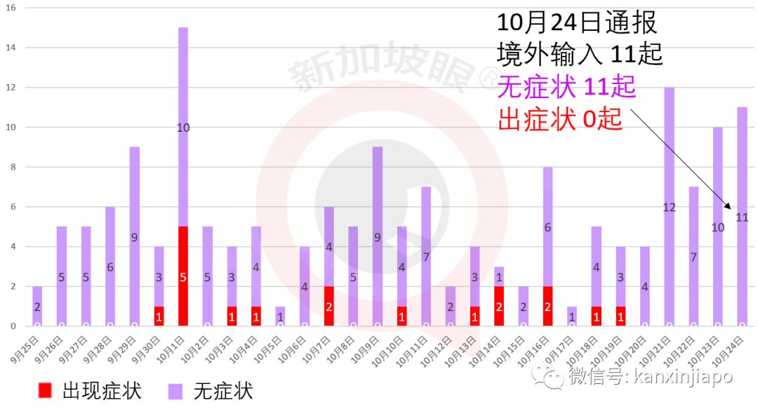 昨天通报境外输入病例11起,皆无症状,在指定地点执行14天居家通知SHN时,检测结果呈阳性,于10月23日确诊。此11起病例情况如下:出发地:印度5人、印尼3人、菲律宾2人、法国1人国籍:新加坡公民3人、印尼公民3人、新加坡永久居民1人、印度公民2人、菲律宾公民、法国公民各1人身份:WP客工3人、新加坡公民3人、持LTVP长期探访证2人、持STVP短期探访证1人、永久居民1人、留学生1人