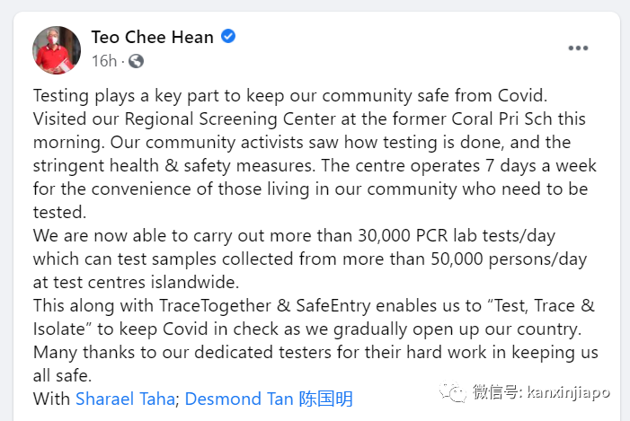 位于巴西立的区域检测中心的前身是云海小学。以上照片皆取自张志贤脸书。张志贤强调,冠病检测与“合力追踪”是新加坡控制冠病并逐渐开放的其中两个重要手段。日前,《新加坡眼》报道,政府把“合力追踪”TraceTogether使用率至少达到七成人口作为解封第三阶段的先决条件之一。