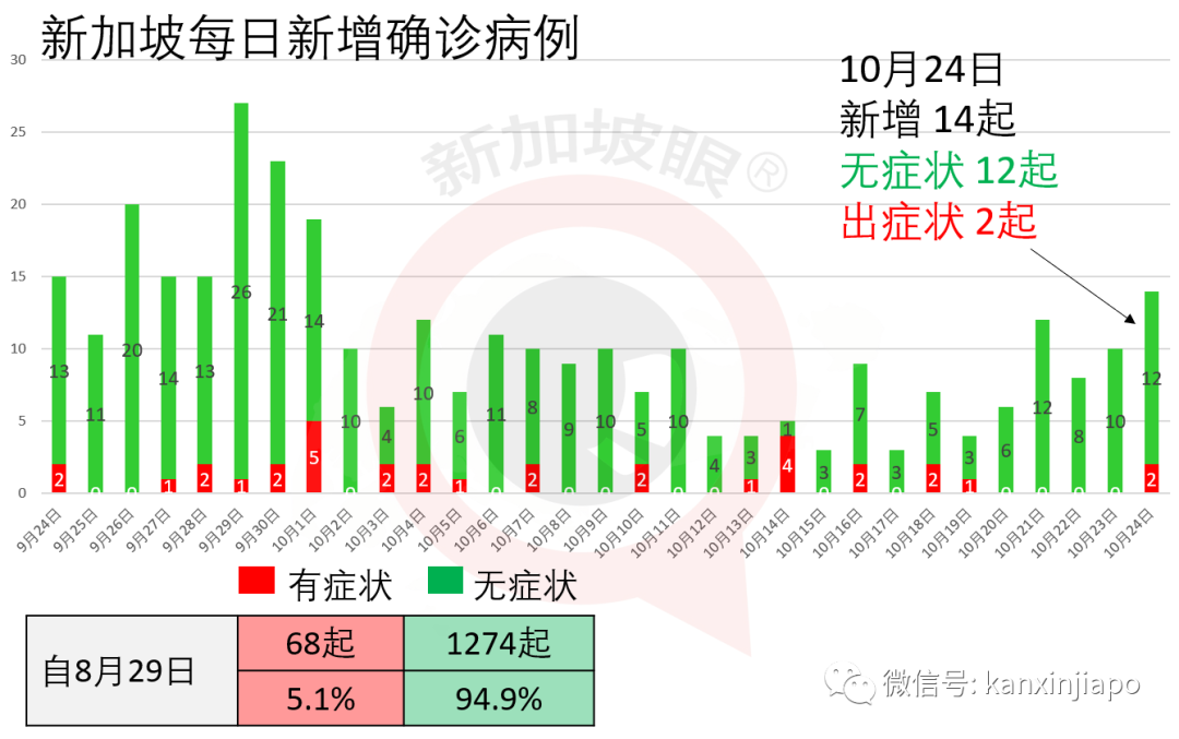 从8月29日至10月24日,新加坡一共出现1342起病例,出现症状的有68起,占5.1%,其余94.9%为无症状,有1274起。新加坡自9月15日未出现新感染群。本土病例新增3起其中2起为机场T3工作人员