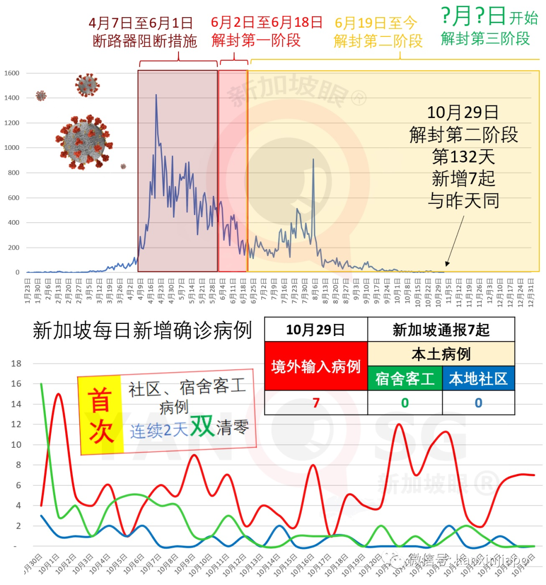 10月29日,新加坡新增确诊7例,全都是输入病例,累计病例达57994起。今天没有本土病例,也是首次出现本土病例(宿舍客工+本地社区)连续两天零新增。卫生部将在今晚公布其他详情。