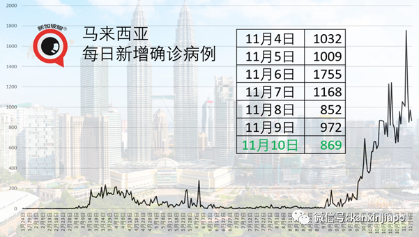 11月10日,马来西亚新增869起确诊病例,维持在千例以下,累计42050起。