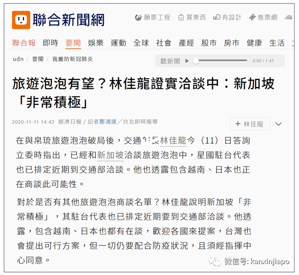 根据台湾《联合报》和“中央社”等近日报道,台湾方面正与新加坡等讨论启动“旅游泡泡”。《联合报》报道,11月11日,台交通部门负责人林佳龙出席立法院交通委员会时,回应国民党立委洪孟楷质问时说,在与帕劳旅游泡泡破局后,已经和新加坡洽谈旅游泡泡中,新加坡驻台代表已排定近期到该部洽谈。 他说,包含越南、日本也都有在谈,欢迎各国来提案,台湾也会提出可行方案,但一切仍要配合防疫状况,且须经指挥中心同意。 至于帕劳计划为何破局,林佳龙答询表示,帕劳是因为该国政府正值总统大选,担心其国内防疫能量不足,若一下子开放会对防疫设备、人力造成压力,因此未如期开放。林佳龙表示,帕劳国内对开放旅游泡泡仍有不同意见。中央社报道,11月12日,林佳龙受访时说,关于旅游泡泡,新加坡积极与台湾接触,同时,台湾与日、韩、越南等国双边观光主管机关都有交流。 林佳龙说,对于旅游泡泡,新加坡很主动接触,在台湾不只拜访交通部门,也拜访了很多其他部门与机构。 中央社引述他说:“我们都要做超前部署,时间上的判断涉及到国际疫情、疫苗的研发进展、各国的防疫能量。” 至于年底能否展开有关会谈,林佳龙说,双边一直都在谈,新加坡表达希望能够拜会台交通部门,他也很乐意听听新加坡的主张。 如果大家近期有关于如何进入新加坡的各种困惑,都可以在《新加坡眼》APP“进入新加坡”群进行沟通交流。若有相关政策调整,《新加坡眼》也将在群中第一时间告知。 新加坡昨增11起确诊无本土病例 11月12日,新加坡卫生部通报新增确诊病例11起,皆为境外输入病例,本土病例无新增,累计58102起。病患确诊之前到过的地点 卫生部对新发病患确诊之前14天的活动地点进行追查,11月12日通报无新增地点。 昨天境外输入11起 昨天通报的境外输入病例11起,9起无症状,2起出现症状,在指定地点执行14天居家通知SHN时,检测结果呈阳性而确诊。 这11起病例情况如下: 1. 23岁印尼籍女子(第58281例),持STVP短期探访证从印尼入境,无症状,11月11日确诊;她家属在新加坡定居。 2. 42岁尼泊尔籍男子(第58282例),持工作证件从尼泊尔入境,无症状,11月11日确诊。 3. 同为42岁的尼泊尔籍男子(第58283例),持工作证件从尼泊尔入境,无症状,11月11日确诊。 4. 62岁男性新加坡永久居民(第58284例),从巴林入境,11月4日出现症状,11月11日确诊。 5. 65岁缅甸籍妇女(第58285例),持STVP短期探访证从缅甸入境,无症状,11月11日确诊;她家属在新加坡定居。 6. 39岁印尼籍男子(第58286例),WP客工,从印尼入境,11月10日出现症状,11月11日确诊;他是第58251例的密切接触者;第58251例是49岁印尼籍男性客工,无症状,11月8日确诊。 7. 45岁男性新加坡永久居民(第58287例),从印度入境,无症状,11月11日确诊。 8. 38岁女性新加坡永久居民(第58288例),从印度入境,无症状,11月11日确诊。 9. 34岁印尼籍女子(第58291例),WP客工,从印尼入境,无症状,11月11日确诊。 10. 52岁巴基斯坦籍妇女(第58292例),持DP家属证,从巴基斯坦入境,无症状,11月11日确诊;她是第58250例的密切接触者;第58250例是47岁男性新加坡永久居民,从阿联酋入境,无症状,11月7日确诊。 11. 44岁新加坡籍男子(第58293例),从阿联酋入境,无症状,11月11日确诊;他也是上述第58250例的密切接触者。 从8月29日至11月12日,新加坡一共出现1479起病例,出现症状的有85起,占5.7%,其余94.3%为无症状,有1394起。 现存病患72人 11月12日,新加坡卫生部通报,当天12人病愈出院,累计病愈58002人;现存病患为72人,比前天减1人。 昨天的现存病患包括:中症病房有48人;24人在社区护理设施或社区康复设施。 重症加护病房无人。 新加坡自10月12日无新增死亡病例,累计28起。 马来西亚昨增919起确诊 11月12日,马来西亚新增919起确诊病例,连续5天维持在千例以下,累计43791起。