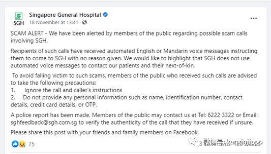(图源:新加坡中央医院脸书) 新加坡中央医院(SGH)近期频频接获公众举报,称接到来自医院的诈骗电话。中央医院上星期三(11月18日)在脸书发出通知,要公众注意了。 院方郑重提醒,若接到医院不明的来电,以华语或英语录制语音方式,要求对方跑一趟医院,请民众要提高警觉。因为新加坡中央医院从来不用录制语音通知病患或家属前来医院。