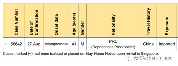 根据《新加坡眼》统计,上一次出现中国输入病例是8月27日,当天通报1起41岁中国籍男子(第56642例),持DP家属证,从中国入境,无症状。