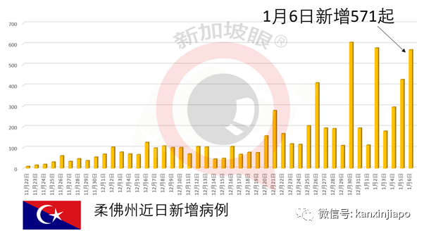 雪兰莪是确诊病例最多的州属,新增965起病例,逼近千起,是当日确诊人数最高的州属,占当天确诊人数的37%;柔佛571起(22%)、沙巴405起(16%)、吉隆坡265起、森美兰125起、槟城77起、吉兰丹43起、吉打42起、霹雳34起、登嘉楼19起、马六甲13起、彭亨11起等等。 最靠近新加坡的柔佛大增571起,占当日全国确诊人数之22%。近日柔佛病例数据如下: