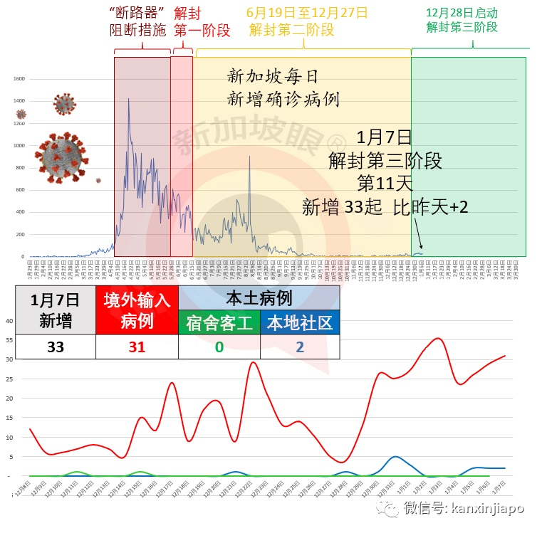 1月7日,新加坡卫生部通报初步统计:今天新增确诊33例,累计58813例。新增病例当中,境外输入31起、社区病例2起。输入型病例包括7名新加坡公民或永久居民,以及12名外籍女佣。卫生部将在今晚公布其他详情。