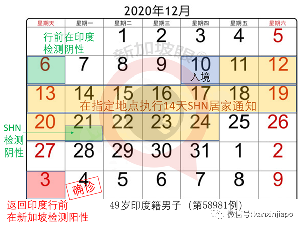 新加坡前天也通报一起境外输入转本土病例。49岁印度籍男子(第58981例),持STVP短期探访证,于12月10日从印度入境,到新加坡探望妻子。在启程之前,12月6日在印度所做的行前检测结果为阴性。抵达新加坡之后,在指定地点执行14天SHN居家通知,直至24日。在SHN 期间,12月21日接受冠病检测,结果亦呈阴性。1月3日,准备返回印度之前,进行行前检测,结果呈阳性,无症状,1月4日确诊,送去伊丽莎白医院。他的血清抗体呈阳性,意味着既往感染。