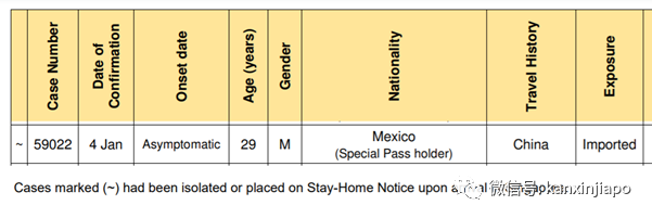 此29例情况统计如下: WP客工16人,分别从印度、印尼、缅甸入境,其中12人为外籍女佣。 持工作证件的有5人,从印度、印尼、阿联酋入境。 持STVP短期探访证3人,从菲律宾、日本入境2人,到新加坡参与工作项目,从印尼入境1人,到新加坡探望新加坡籍丈夫。 新加坡公民1人、新加坡永久居民2人,分别从英国、印度入境。 持DP家属证1人,从印度入境。 持特别签证的海员1人,29岁墨西哥籍男子(第59022起),随船海员,从中国入境,检测时确诊,无症状。