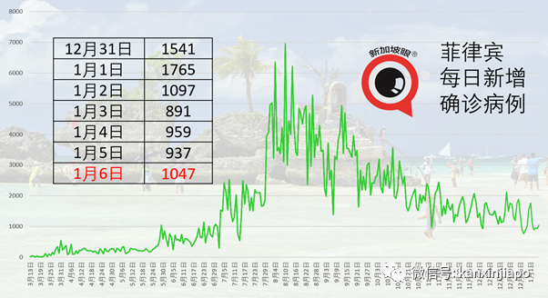 1月6日,泰国大增365起确诊病例,累计9331起。 其中349起为本土病例,16起为境外输入病例。 在349起本土病例当中,99起为外劳,230起为本地社区病例。 当日通报1起新增死亡病例,累计66起。《曼谷邮报》报道,新增的这1起死亡病例是63岁本地人,日常工作是接送外劳上下工。他12月27日住院,后因多脏器功能衰竭,于1月5日病逝。 菲律宾昨增1047起累计确诊病例破48万起