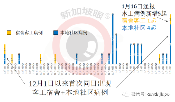 昨天新增的5起本土病例当中,4起为本地社区病例,1起为大型集体客工宿舍病例。这是12月1日以来,首次同日出现本地社区和客工宿舍病例。本地社区病例含一名中国籍客工【本地社区病例一:童子军总部行政员、兼职司机】39岁新加坡籍男子(第59340例),是位于碧山12街的童子军协会的行政人员,也是Westpoint运输公司的兼职司机,驾驶路线川行是Cameron 公司(地址:2 Gul Circle)和GlaxoSmithKline Tuas葛兰素史克大士公司(地址:10 Tuas South Avenue 8)之间。他1月11日出现发热症状,以视频远程求诊,出现症状之后没有上班;1月13日接受检测,1月15日确诊,以专用救护车送去国家传染病中心。他的血清抗体呈阴性,意味着新近感染。所有密切接触者已集中隔离。【本地社区病例二:银行行政人员】39岁新加坡籍女子(第59351例),是上述第59340例的妻子。1月13日出现急性呼吸道感染症状,1月14日到诊所求医,当天到综合诊所接受检测,1月15日确诊,以专用救护车送去国家传染病中心。她的血清抗体报告未出。所有密切接触者已集中隔离。她是OCBC华侨银行淡滨尼中心分行的行政人员,不与客户有接触,最后一天上班是1月8日。【本地社区病例三:食品厂客工】33岁中国籍男子(第59343例),WP客工,在圣诺哥南路(Senoko South Road)的Golden Bridge金桥食品私人有限公司工作。1月7日出现咳嗽症状,当天到诊所求医,1月8日检测结果为阴性;他1月7日至12日休病假在家,1月13日返回上工。1月14日出现发热症状,到邱德拔医院求诊并接受检测,1月15日确诊,以专用救护车送去国家传染病中心。他的血清抗体为阴性,意味着新进感染。所有密切接触者已集中隔离。