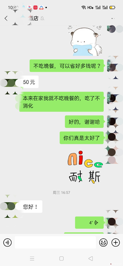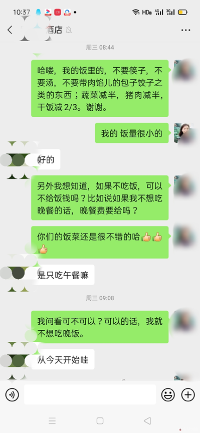 吃了几餐后,发现太浪费了,和酒店人员沟通,减量,并申请不吃晚餐;如果不够,也可以加量不加钱的,下图的沟通