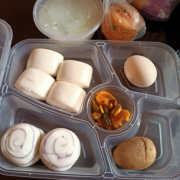 B 一张纸质承诺书(要求1月19日12点前放门外的桌子上);C 一张二维码(隔离结束时,家乡或者社区来接你的信息,就是通过这个传递出去的)。到这里你会发现吧?除登机前的国际健康码需要你独立完成申报以外的所有其他流程,都会有人协助你,即使没有做到,也会提醒你。有没有感到倍受关怀呢?填好二维码的信息,扫一眼“温馨提示”,拿出飞机上的香蕉,面包,矿泉水,觉得好香甜啊!这一天从早上8点到凌晨,16个小时整,为了避免在飞机上用洗手间,只给身体提供了零食和300毫升的水,居然不饿不渴不倦。这也间接证明了人的耐受力,以及人的需求是不需要太多的哦。咚、咚、两声不大不急的敲门声,看时间不到8点,估计是早饭来了,太困懒得起,睡到自然醒,直到时针指到9点,开门拿早饭。隔离第一餐开始啦,香喷喷的稀饭还有余温,泡菜特别好吃。其中稀饭,土豆,鸡蛋,泡菜,皇帝柑都是挑食的我乐意接受的,美美的早餐。