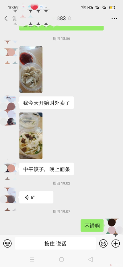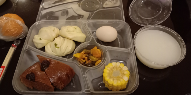昨天来做血清检测的医务人员告诉我,我们这个航班随机分布在5个不同的酒店里(开始还以为分3个酒店)。每个酒店规管理会有差异,同机友的酒店包早餐,不包晚餐和午餐,自己点外卖,他说也很方便;我们这个酒店的山东老乡,吃不惯川菜,自己点外卖。各取所需,能够迫不及待品尝到家乡的味道,给隔离生活增添了些许慰藉。