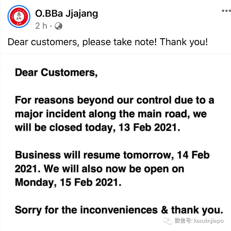 丹戎巴葛路一家韩国料理餐馆在脸书上发帖,说“由于主路上发生我们控制范围以外的严重事件,我们今天(2月13日)只能关闭一天;2月14日恢复营业。2月15日也会继续营业。引起不便,在此致歉。”