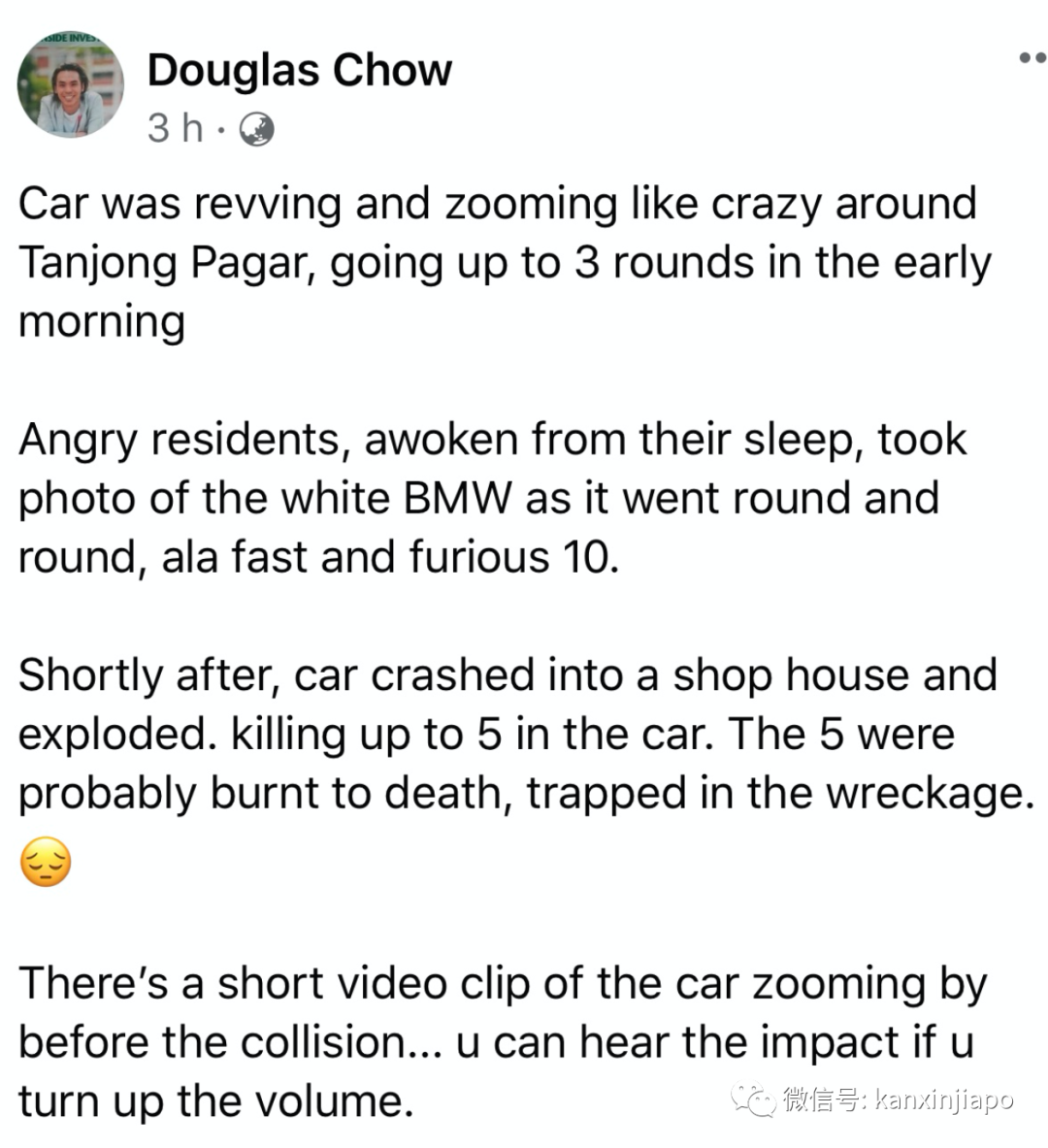 网络上传出视频,不知是否与此事有关。视频中一辆白色跑车高速跑在事故发生的道路上。?网友在脸书上留言说,一大清早,这部车就在丹戎巴葛轰鸣着发动机绕三圈。被吵醒的居民们一肚子怒火,拍下了照片。不久后车子冲进骑楼,起火。