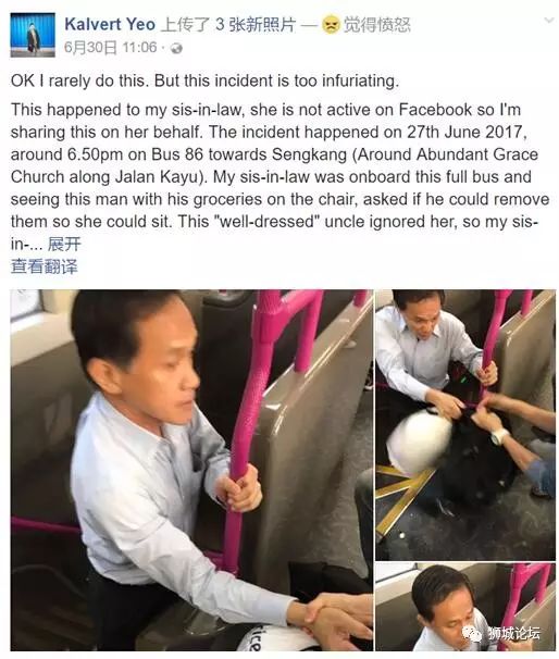 (翻译:这件事发生在我的嫂子身上,因为她在FB上并不活跃,所以我分享一下她的经历。这次意外发生在2017年6月27日,大概是在下午6点50分左右,在去往盛港的86号巴士上。当时车上的人很满,我的嫂子就上楼找座位,后来看到这名男子的一些商品占了一张椅子,于是就问他能不能挪开一下,让她可以坐下。可是这个穿着很好的安哥却忽视她,于是我的嫂子就尝试拍下他的不礼貌行为。突然之间,这个无理取闹的男子又抓又拽我嫂子的手臂,还把她的手机扔在地上。然后他尝试马上逃跑,可是不幸的是,当时车上的其他乘客帮忙捉住了他,好让警察能前来处理这件事。)