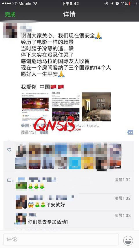 见到走散同事后抱着他们大哭 一个房间躲10多个不同国家的人金女士说,所有的人都在尽可能快地往前跑,她和另外一个女同事被一位男同事护着跑上了电梯,但也跟另外3个同事分散了。但非常幸运的是,电梯里有一位危地马拉人说,可以去他们的房间躲一下。电梯到达9楼后,他们又正好遇见了走散的另外3位同事,“发现大家都没事。”