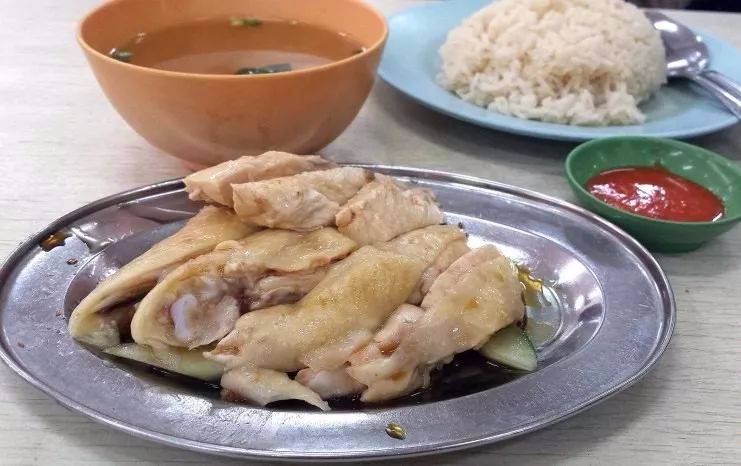 一盘满满的鸡饭和一盘鸡肉,这家店卖S$3.80。鸡饭的味道偏淡,但是加上辣椒酱刚刚好,这里的鸡肉偏软。