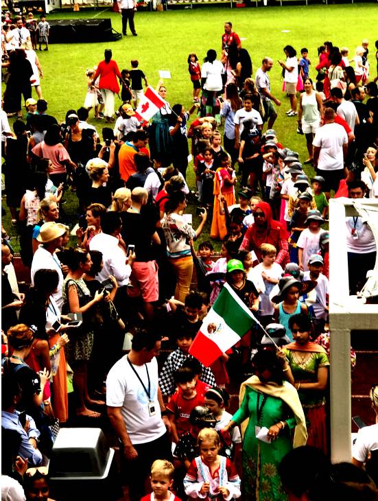 ▲每个孩子当天穿着代表自己国家文化的服装,参加游行集会