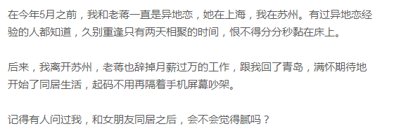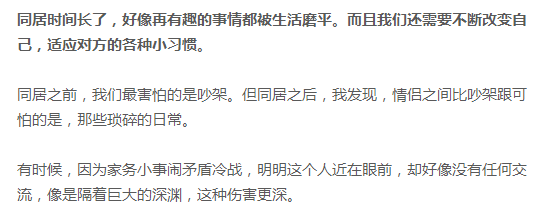 不少读者跟我说过,熬过异地,却在同居没几天后分手了。因为感觉对方不如异地时在乎自己了,总是低头玩手机,回家就倒在床上,不做饭更不做家务,实在无法忍受。