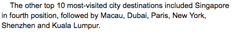 报告说,随着中国出境旅游的蓬勃发展,未来十年,亚洲城市预料将垄断排行榜的前几个名次。新加坡是全球抵境旅客第4多的城市。