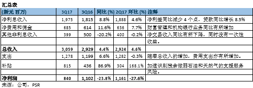 由于NPA被积极追认和净补贴的支出,我们将2017财年的净收入增长调整至3.1%,与管理层的意见一致。 我们2017财政年度的净收入增长预测为20.5%。随着清理尽可能多的石油和天然气风险,2017年四季度的专项准备金可能继续有所提高。尽管如此,这将为2018财年的总信贷成本低于27个基点的全周期水平铺平道路。今年和明年的潜在贷款增长率为7%-8%,高于今年初的中个位数百分比的指导意见。总的来说,我们认为这一举措,将扫除石油和天然气的风险,为2018财年预备一个更为强劲的业绩前景。