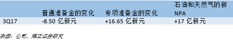 8.15亿新元的净补贴,是为了加速识别残余的油气资产支援服务的风险。 2017第三季度的专项准备金为16.65亿新元,由来自GP回拨的8.50亿新元所补偿,导致净补贴为8.15亿新元, 支出在损益线上。这与本季度新确认的石油和天然气的NPA为17亿新元相一致。在2017第二季度的石油和天然气的NPA为14亿新元,另新增确认了17亿新元,至现在的石油和天然气总NPA为30亿新元,从而占石油和天然气的较高风险为53亿新元的57%。本季度,大宗专项准备的费用有所增加,总的专项准备补贴由2017年二季度的13亿新元,增加至25亿新元。在专项准备补贴的总额中,其中的15亿新元用于支付石油和天然气的30亿新元的NPA。