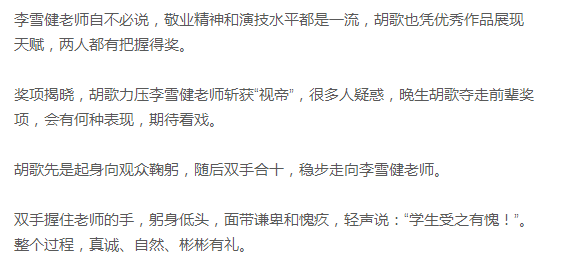 发表获奖感言时,胡歌又提到,李雪健老师生活简朴,晚辈却奢侈浮华,深感愧疚,应当时时研习老师质朴的生活精神。
