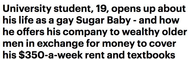 据daily mail 报道,化名为Alexander的澳洲男大学生就是sugar baby中的一员。前不久,他向媒体讲述了自己在澳洲作为sugar baby的大学生活: