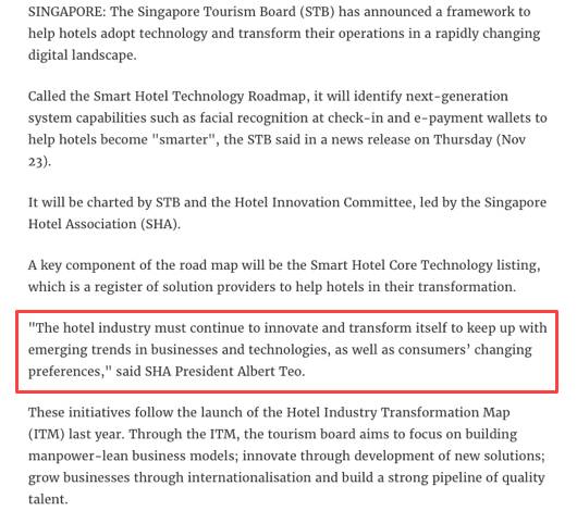 根据新加坡8频道新闻、The Straits Times 和 Channel NewsAsia 报道:在全球迈向智慧型的时代,新加坡酒店业也不落人后。新加坡旅游局推出智慧型酒店科技蓝图,协助新加坡酒店业者采纳新科技,丰富顾客的住宿体验。