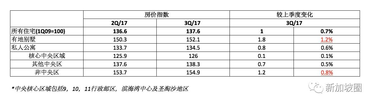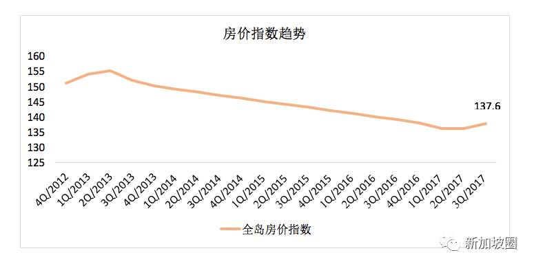 由于第三季度房产市场的活跃表现,综合上半年,2017年至今私人房产累计上涨0.3%,房产指数收于137.6。较去年全年下跌2.6%相比,去年年末的购买私人住宅的投资者以及取得了一定程度上的资产增值。