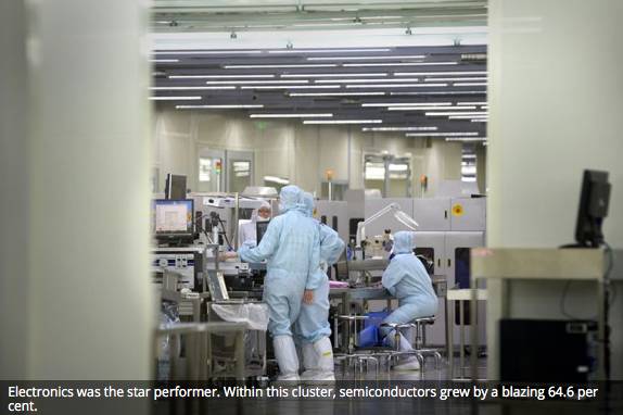 电子业领域的产值同比强劲扩张45.1%,主要由强劲增长64.6%的半导体领域所带动。这是新加坡电子业三个月来的最快增速,半导体领域已连续20个月出现双位数增长。