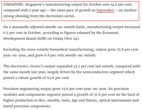 根据新加坡联合早报、The Business Times 和 Channel NewsAsia 报道:在强劲电子业的带动下,新加坡制造业产值连续15个月上扬,10月份同比增长14.6%。