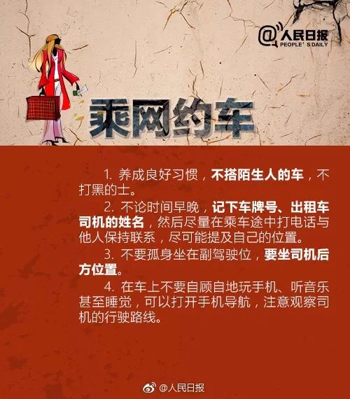提醒姑娘们:①网购收货地址最好填单位。②乘网约车坐后排,打开手机导航。③酒店遇险,持续大声地针对个别人呼救……