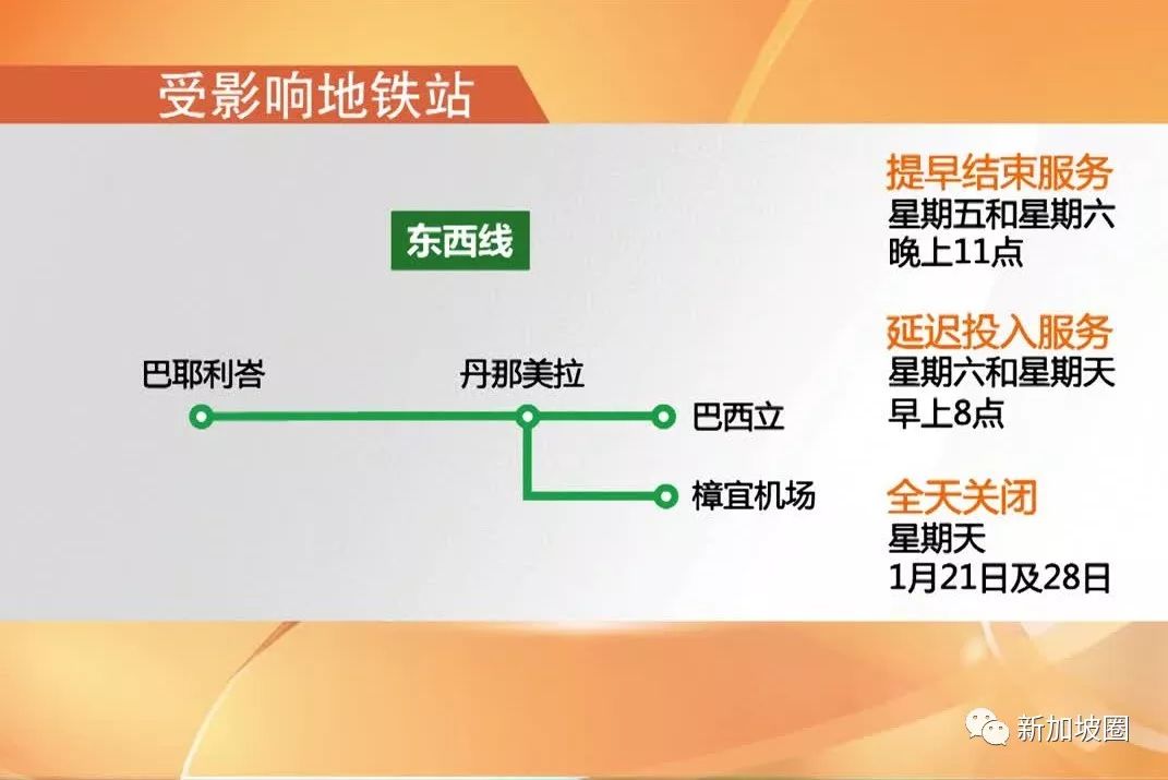 1月份的四个周末,东西线的巴耶利峇站至巴西立站,及博览站和樟宜机场站共10个地铁站的双向列车运作时间都将缩短。