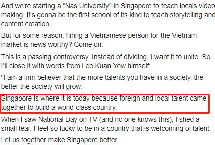 在帖文最后,Nas Daily似乎认为新加坡人有些小题大做。他引用了新加坡已故总理李光耀的一段话,认为新加坡之所以成为现在的新加坡,和本国人才以及外国人才的努力密不可分。